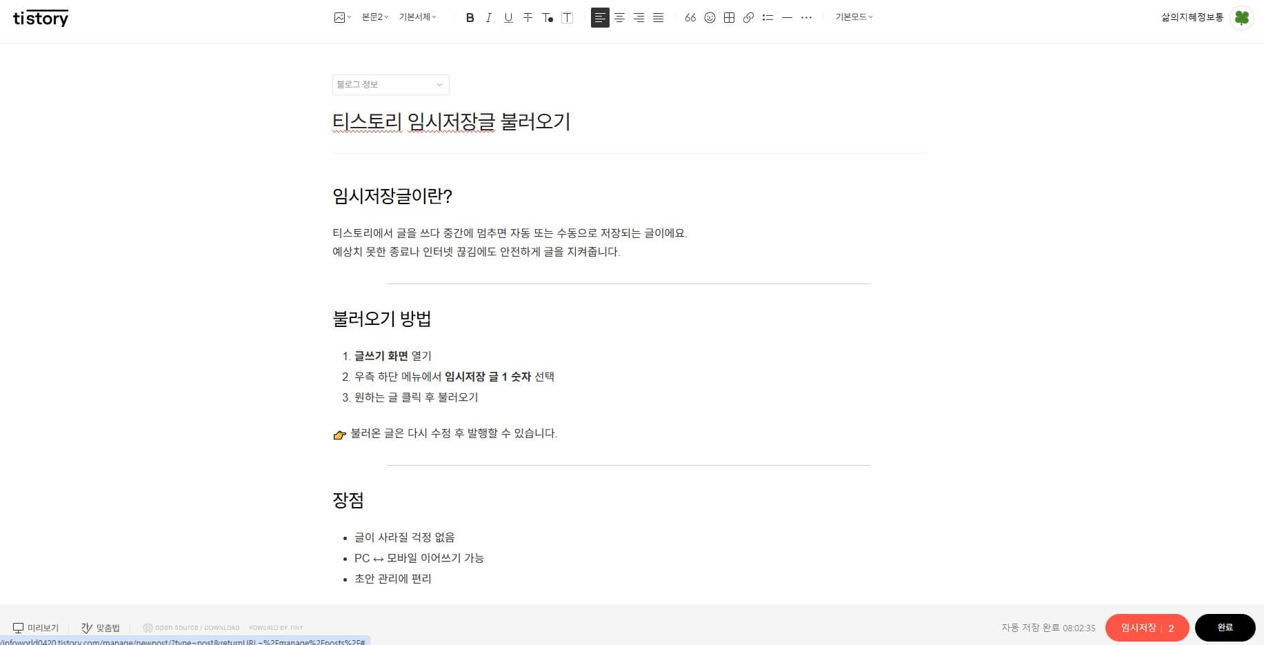 티스토리에서 글을 쓰다 중간에 멈추면 자동 또는 수동으로 저장되는 글이에요.